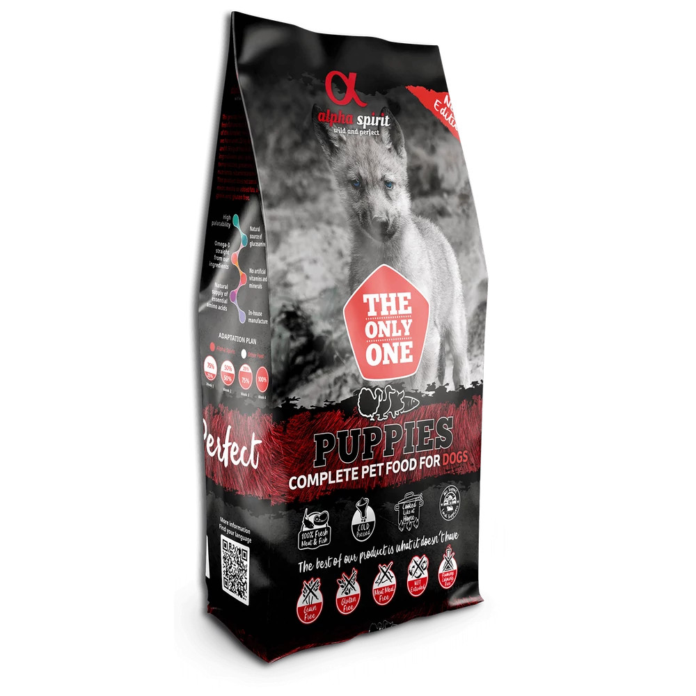 • mert a fókuszt a friss hús kapja – így 1 kg Alpha Spirit The Only One Puppies száraz kölyökkutyatáp előállításához 2,24 kg friss hús és 0,56 kg friss hal kerül felhasználásra