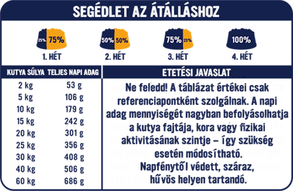 Ne feledd! A táblázat értékei csak referenciapontként szolgálnak. A napi adag mennyiségét nagyban befolyásolhatja a kutya fajtája, kora vagy fizikai aktivitásának szintje – így szükség esetén módosítható.