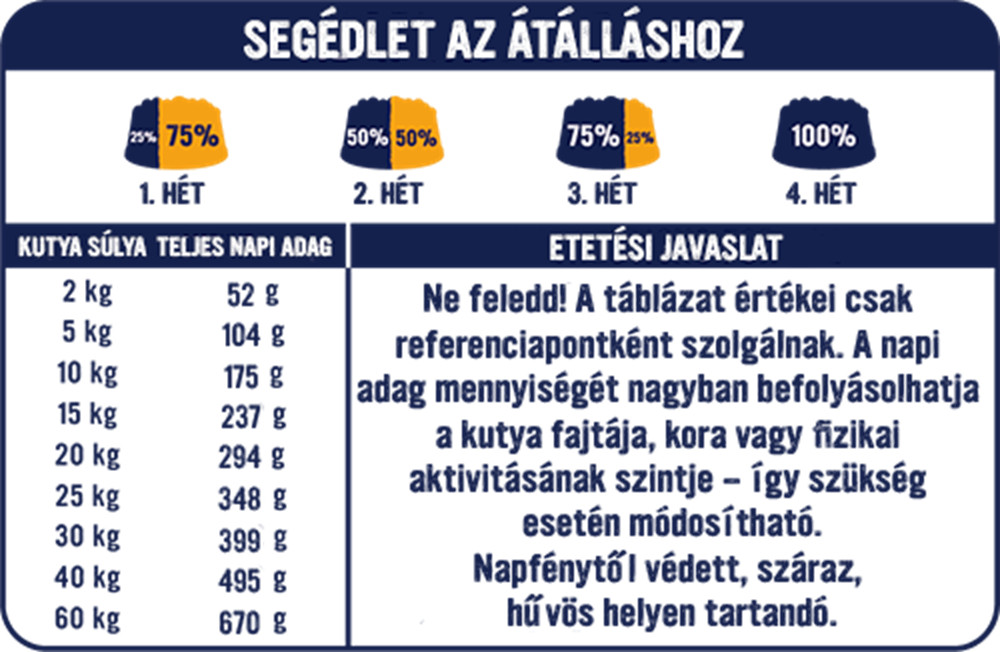 Ne feledd! A táblázat értékei csak referenciapontként szolgálnak. A napi adag mennyiségét nagyban befolyásolhatja a kutya fajtája, kora vagy fizikai aktivitásának szintje – így szükség esetén módosítható.
